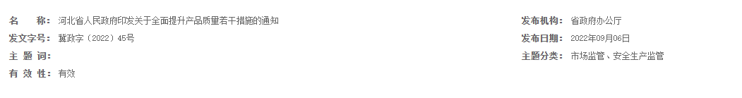 河北省人民政府印發(fā)關于全面提升產品質量若干措施的通知2022年09月06日各市(含定州、辛集市)人民政府,雄安新區(qū)管委會,省政府有關部門: