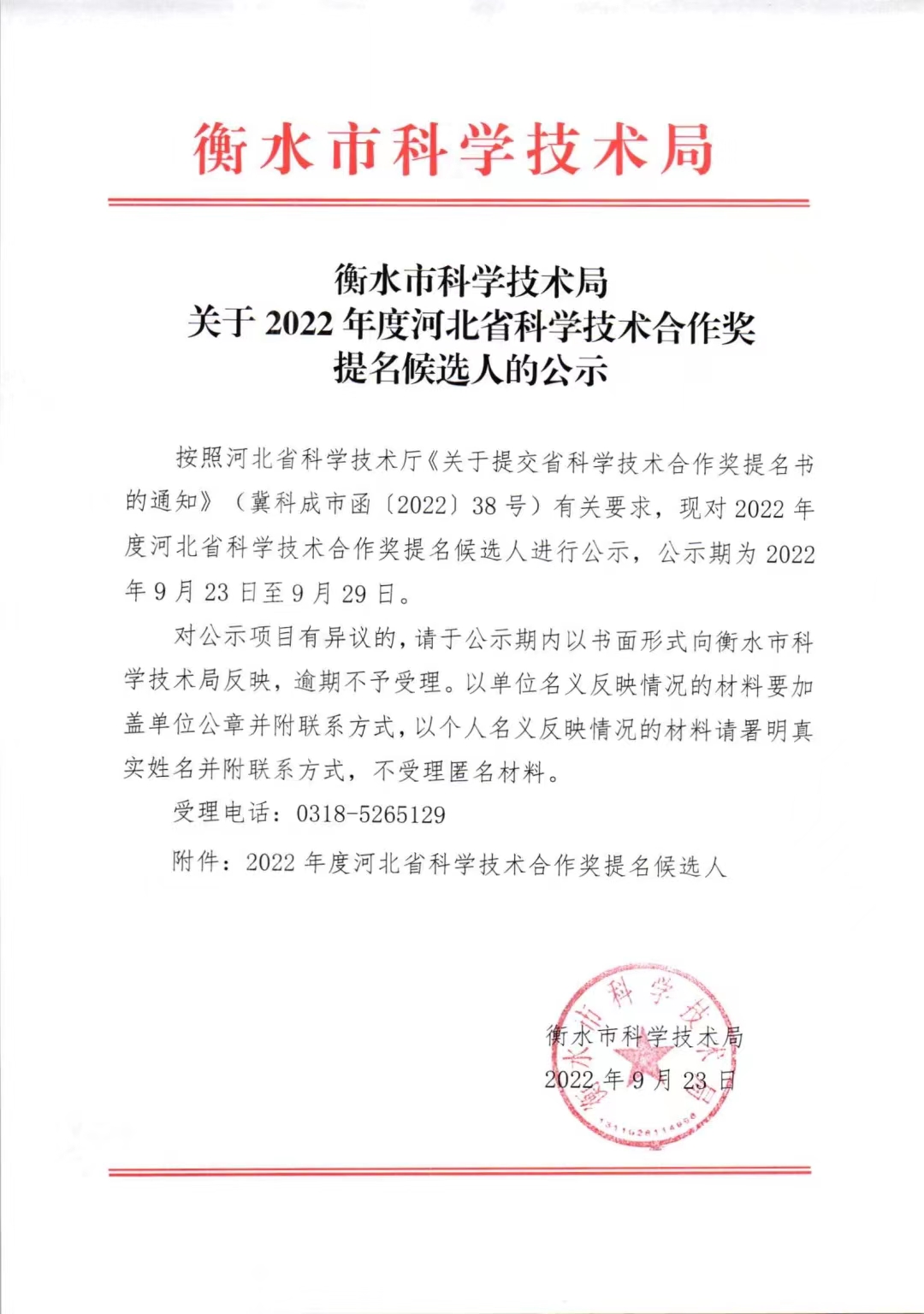 衡水市科學技術局關于2022年度河北省科學技術合作獎提名候選人的公示