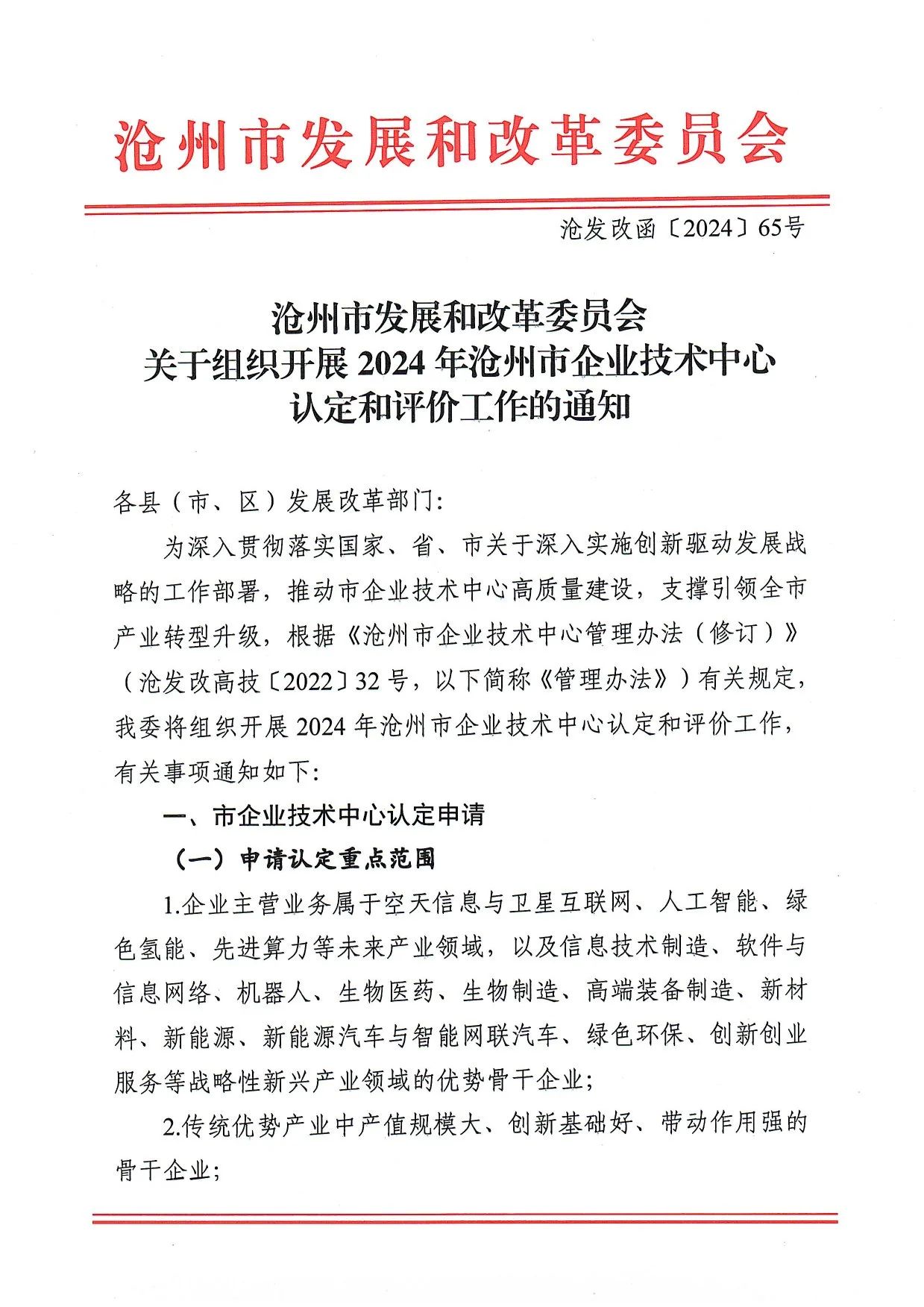 關于組織開展2024年滄州市企業(yè)技術中心認定和評價工作的通知