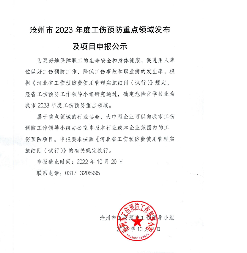 滄州市2023年度工傷預防重點領域發(fā)布及項目申報公示
