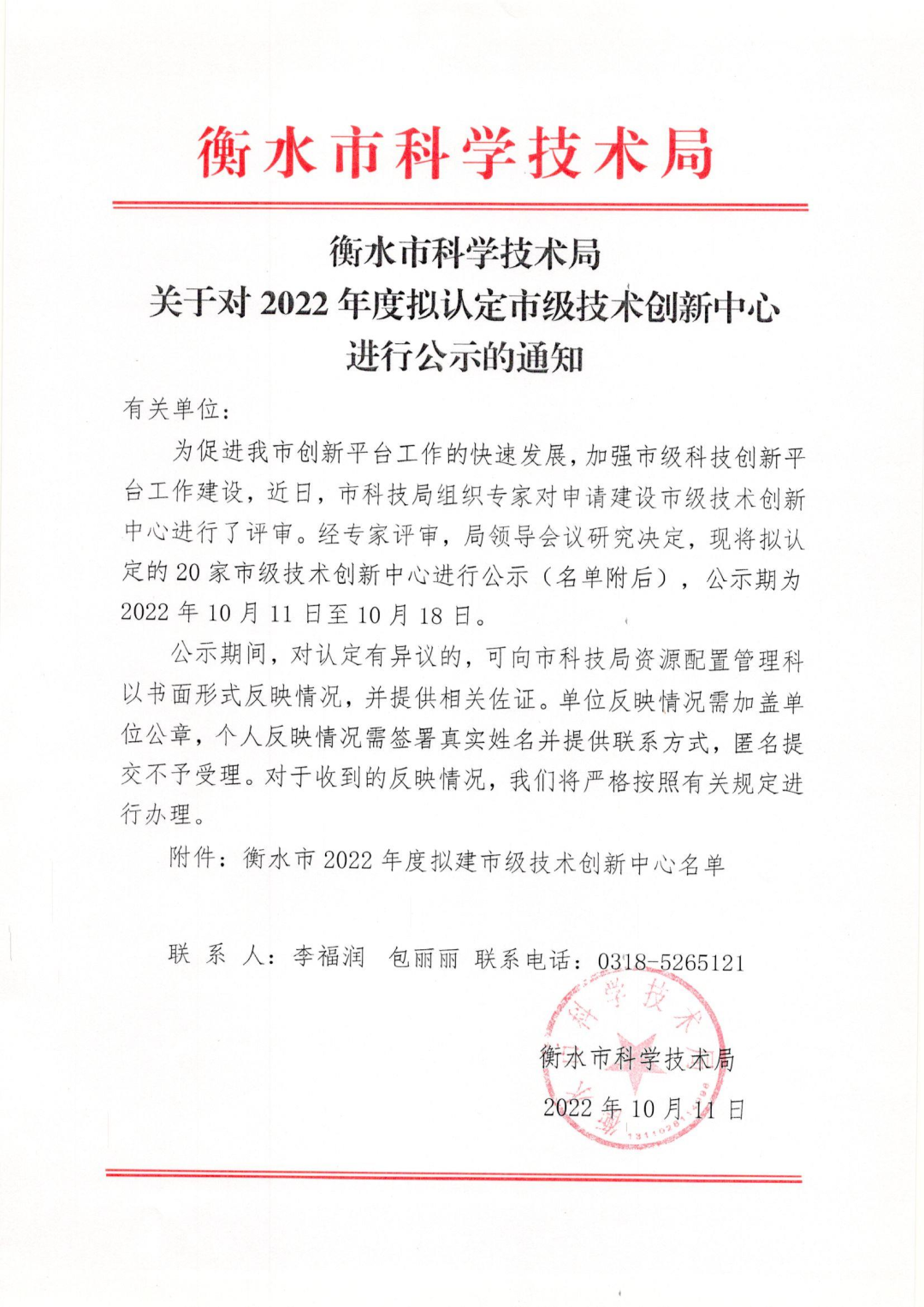 衡水市科學(xué)技術(shù)局關(guān)于對(duì)2022年度擬認(rèn)定市級(jí)技術(shù)創(chuàng)新中心進(jìn)