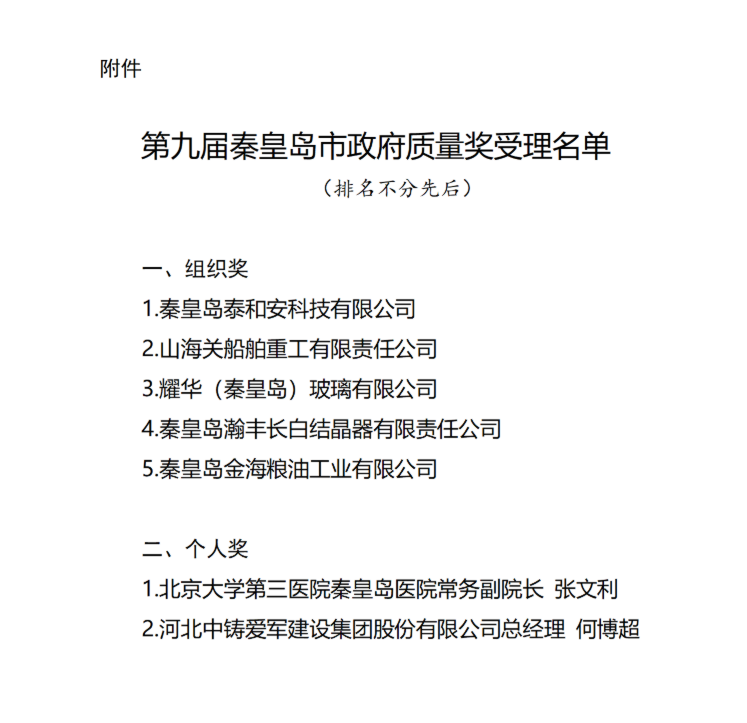 第九屆秦皇島市政府質(zhì)量獎(jiǎng)受理名單公示