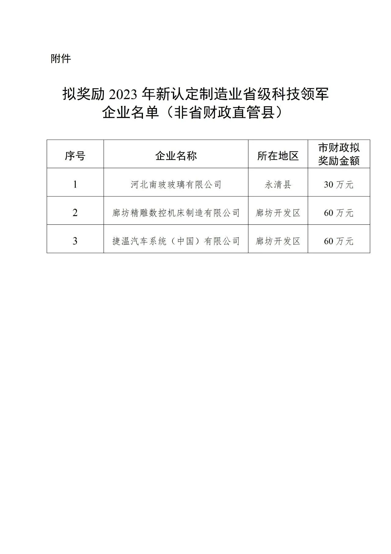 關(guān)于擬獎(jiǎng)勵(lì)2023年新認(rèn)定的制造業(yè)省級(jí)科技領(lǐng)軍企業(yè)的公示日期:2025-10-21 來(lái)源:廊坊市科學(xué)技術(shù)局根據(jù)《關(guān)于加快推動(dòng)全市制造業(yè)高質(zhì)量發(fā)展