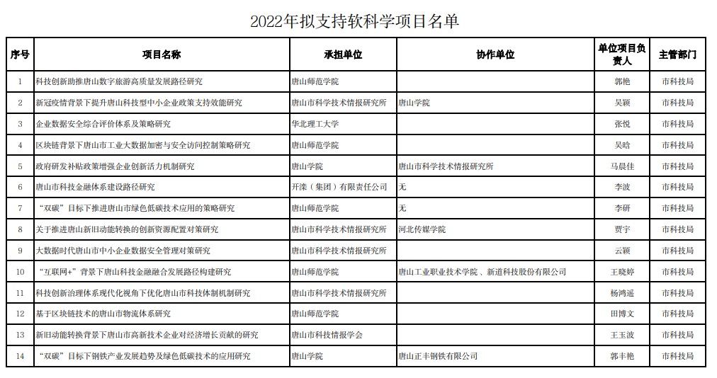 關(guān)于擬支持2022年度軟科學項目的公示依據(jù)《2022年度唐山市市級科技計劃項目申報指南》(唐科資函〔2022〕18號)和《2022年市級科技計劃項目