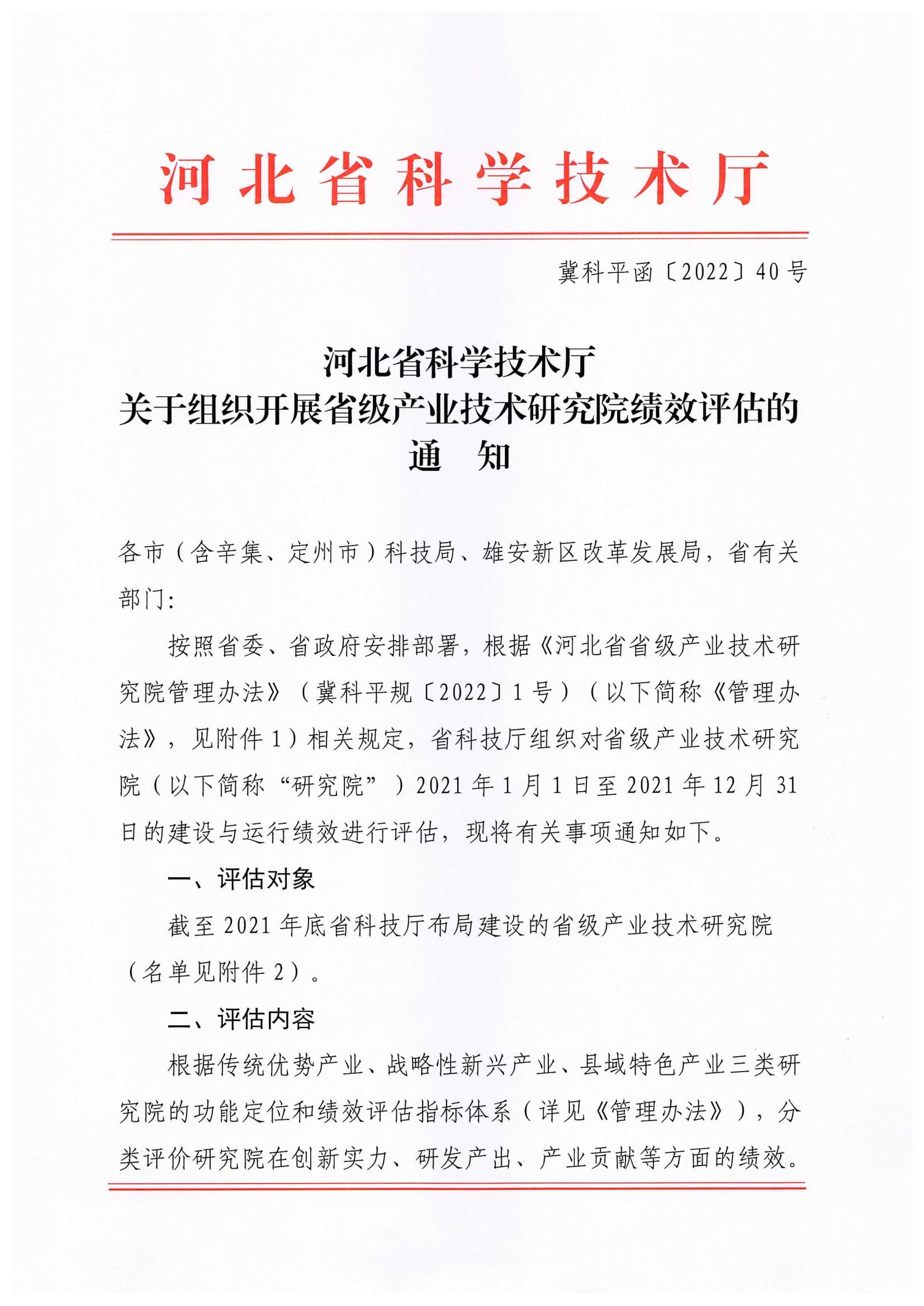 河北省科學(xué)技術(shù)廳關(guān)于組織開展省級產(chǎn)業(yè)技術(shù)研究院績效評估的通知各市(含辛集、定州市)科技局、雄安新區(qū)改革發(fā)展局,省有關(guān)部門: 按照