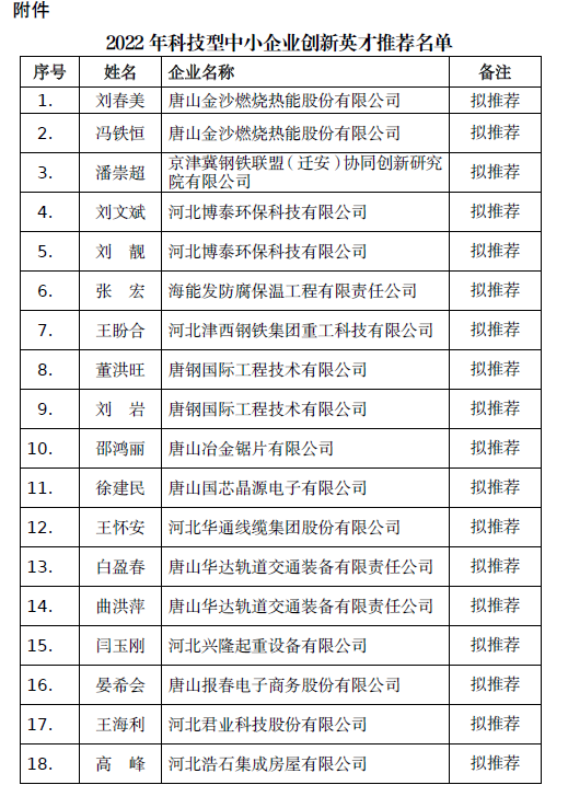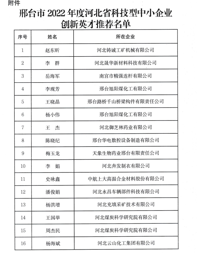邢臺市科學(xué)技術(shù)局關(guān)于2022年度河北省科技型中小企業(yè)創(chuàng)新英才推薦名單的公示根據(jù)河北省科技廳《關(guān)于開展2022年度河北省科技型中小企業(yè)創(chuàng)新英