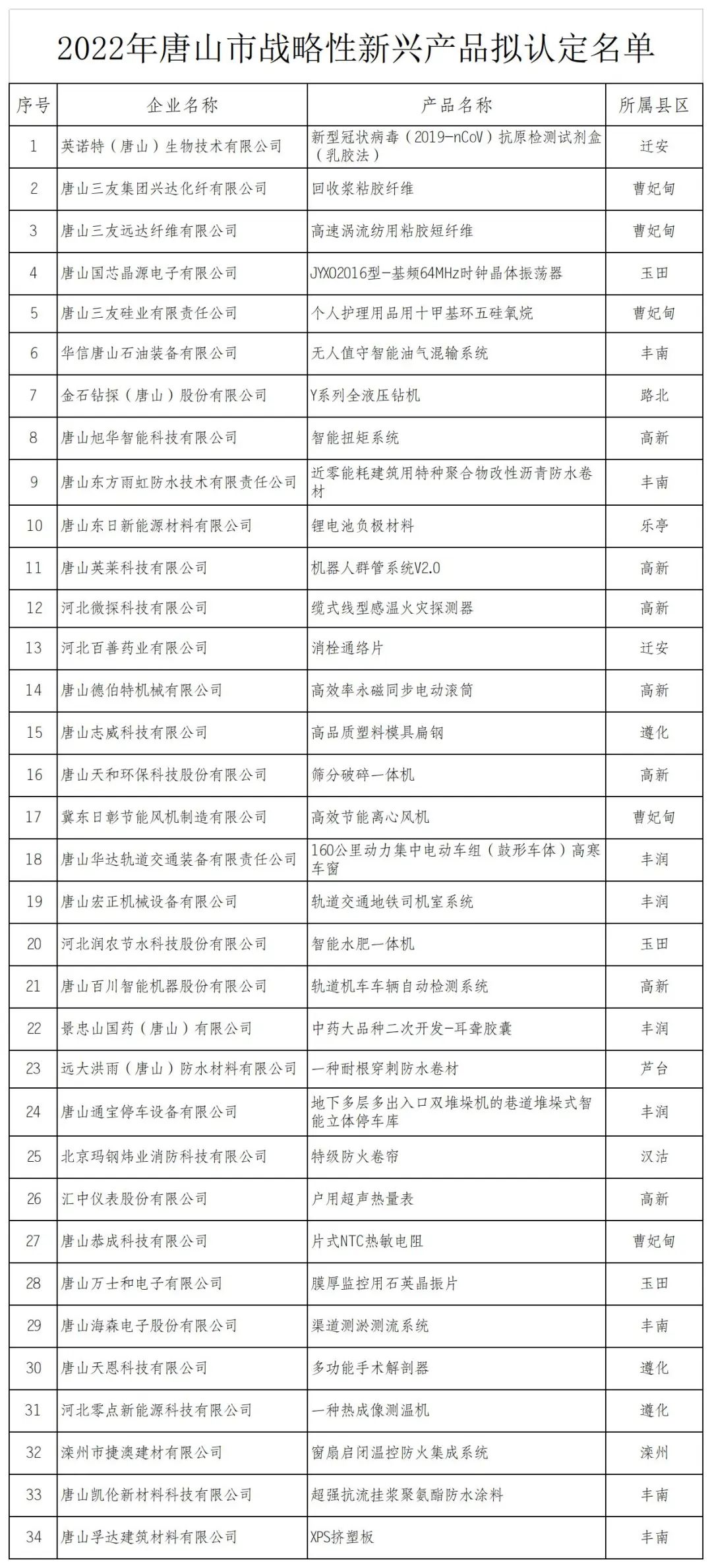2022年唐山市戰(zhàn)略性新興產(chǎn)品擬認定名單公示