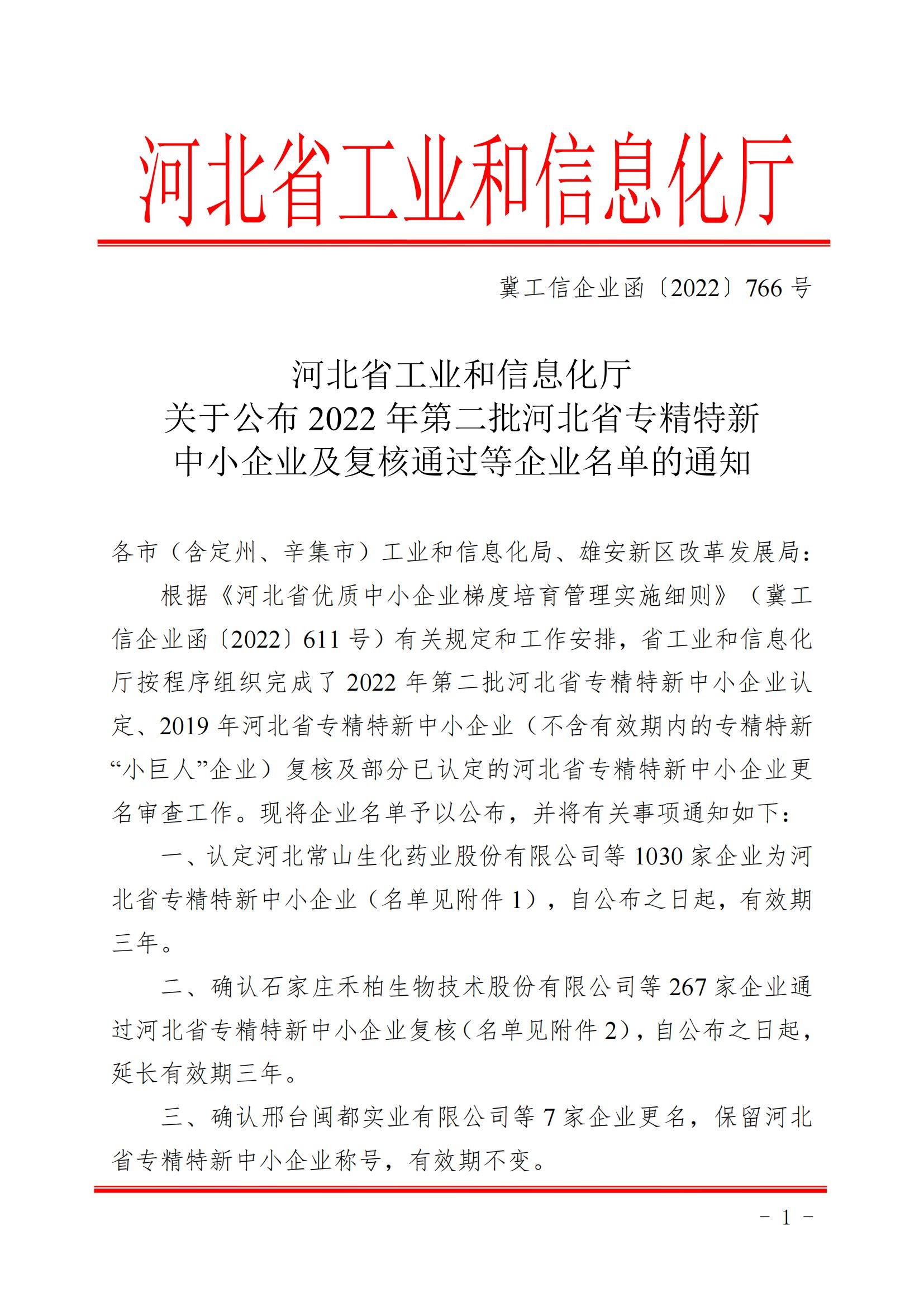 冀工信企業(yè)函〔2022〕766號河北省工業(yè)和信息化廳關(guān)于公布2022年第二批河北省專精特新中小企業(yè)及復核通過等企業(yè)名單的通知各市(含定州、辛