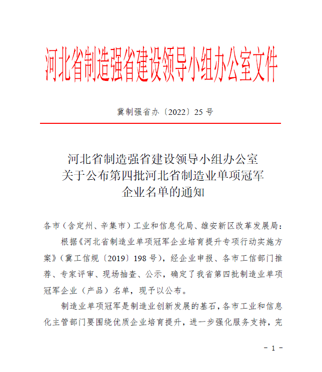 關(guān)于公布第四批河北省制造業(yè)單項(xiàng)冠軍企業(yè)名單的通知冀制強(qiáng)省辦〔2022〕25號(hào)各市(含定州、辛集市)工業(yè)和信息化局、雄安新區(qū)改革發(fā)展局: