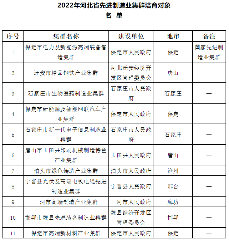 關(guān)于2022年河北省先進(jìn)制造業(yè)集群培育對(duì)象名單的公示