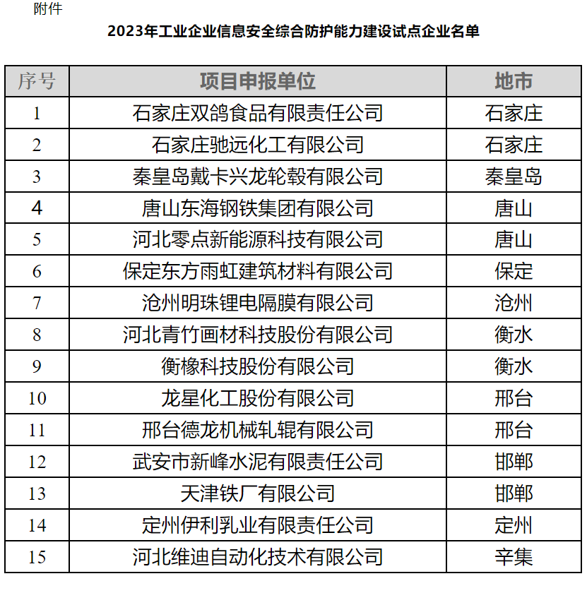 關(guān)于2023年工業(yè)企業(yè)信息安全綜合防護(hù)能力建設(shè)試點(diǎn)名單的公