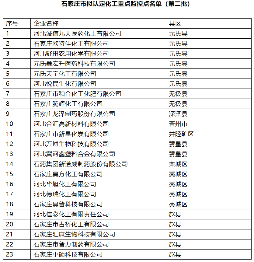 關(guān)于石家莊市擬認(rèn)定化工重點(diǎn)監(jiān)控點(diǎn)名單(第二批)的公示