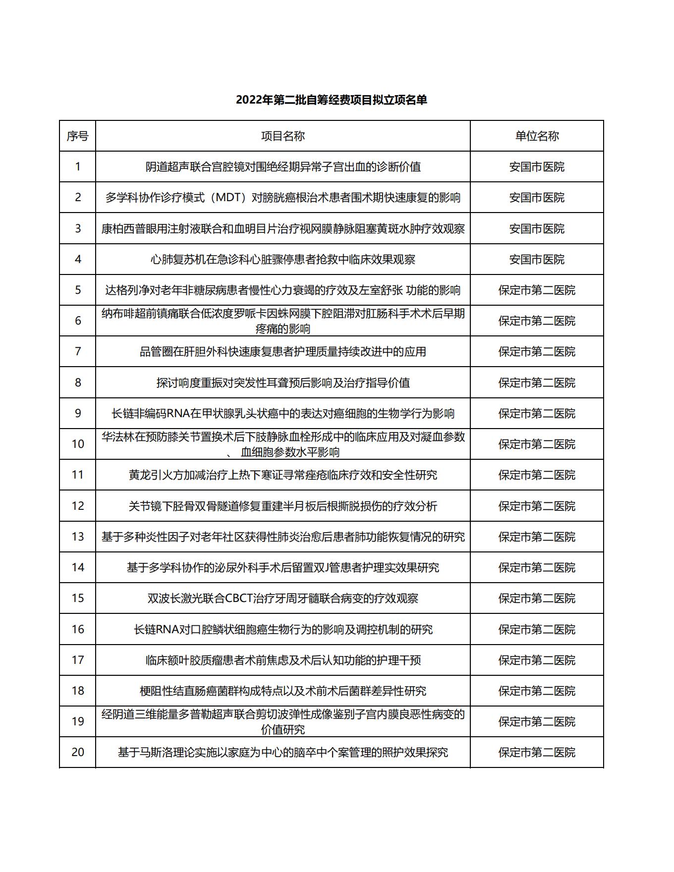 保定市科學(xué)技術(shù)局關(guān)于2022年第二批自籌項(xiàng)目擬立項(xiàng)項(xiàng)目的公示根據(jù)《保定市科技計(jì)劃自籌經(jīng)費(fèi)項(xiàng)目管理辦法》(保科發(fā)〔2022〕11號(hào)),現(xiàn)將2022