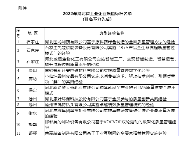 關(guān)于公布2022年河北省工業(yè)企業(yè)質(zhì)量標(biāo)桿名單的通知
