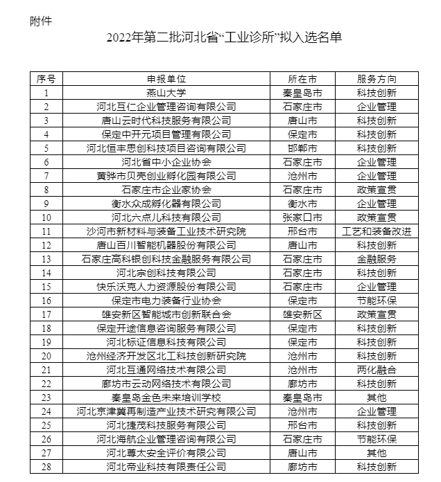 關(guān)于2022年第二批河北省“工業(yè)診所”擬入選名單的公示