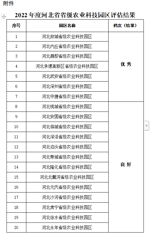 關(guān)于公布2022年度省級農(nóng)業(yè)科技園區(qū)評估結(jié)果的通知河北省科學(xué)技術(shù)廳(含定州、辛集市)科技局,雄安新區(qū)改革發(fā)展局,有關(guān)單位: 為持續(xù)推