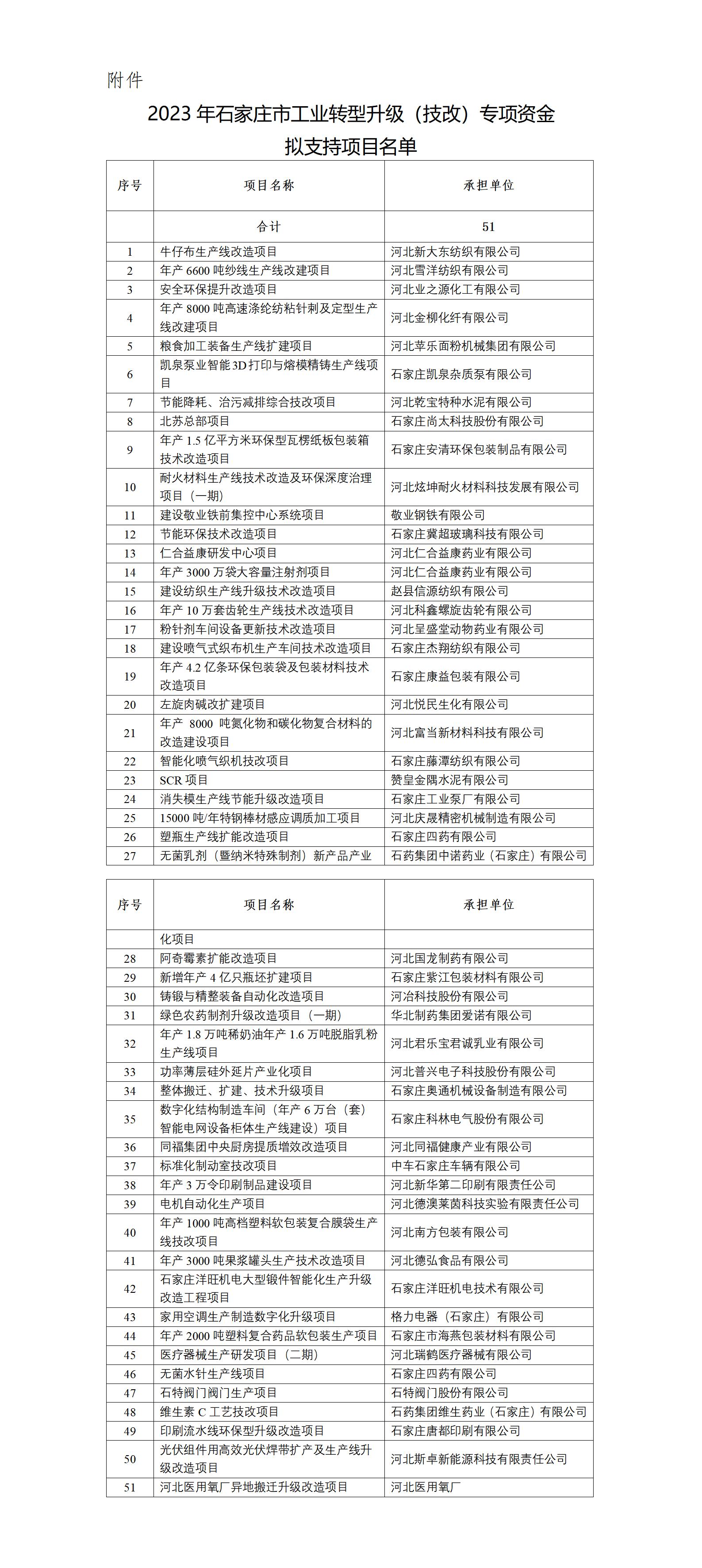 關(guān)于2023年石家莊市工業(yè)轉(zhuǎn)型升級(技改)專項(xiàng)資金擬支持項(xiàng)目的公示 按照《關(guān)于申報(bào)2023年工業(yè)轉(zhuǎn)型升級(技改)專項(xiàng)資金項(xiàng)目的通知》(