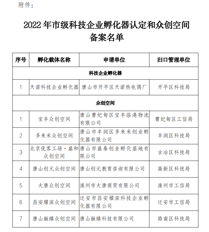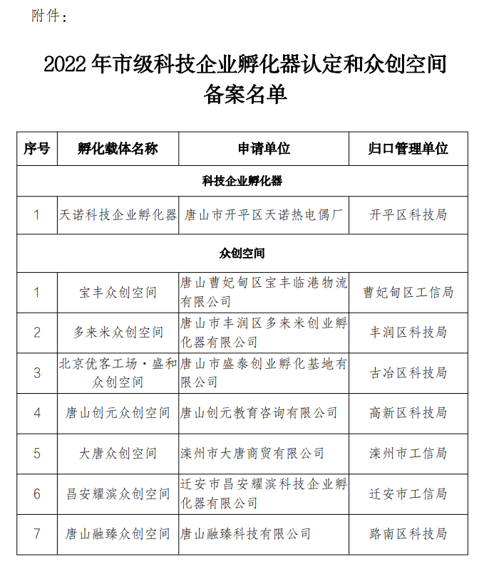 關于 2022 年唐山市級科技企業(yè)孵化器認定和眾創(chuàng)空間備案的公示根據(jù)《唐山市科技企業(yè)孵化器認定和眾創(chuàng)空間備案管理辦法》(唐科規(guī)字〔2021