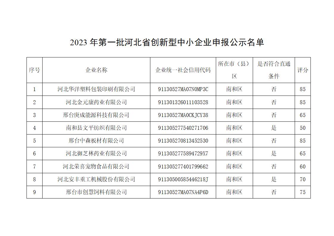 公示邢臺市2023年第一批河北省創(chuàng)新型中小企業(yè)申報推薦匯總表按照河北省工業(yè)和信息化廳《關(guān)于做好2023年優(yōu)質(zhì)中小企業(yè)信息更新和河北省創(chuàng)新型