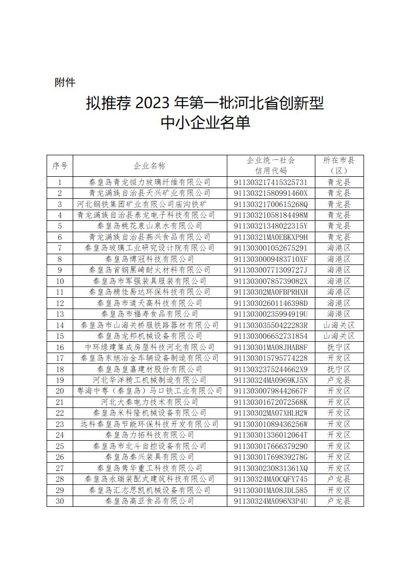 秦皇島市工業(yè)和信息化局關(guān)于擬推薦2023年第一批河北省創(chuàng)新型中小企業(yè)名單的公示按照《河北省優(yōu)質(zhì)中小企業(yè)梯度培育管理實施細(xì)則》有關(guān)規(guī)定和