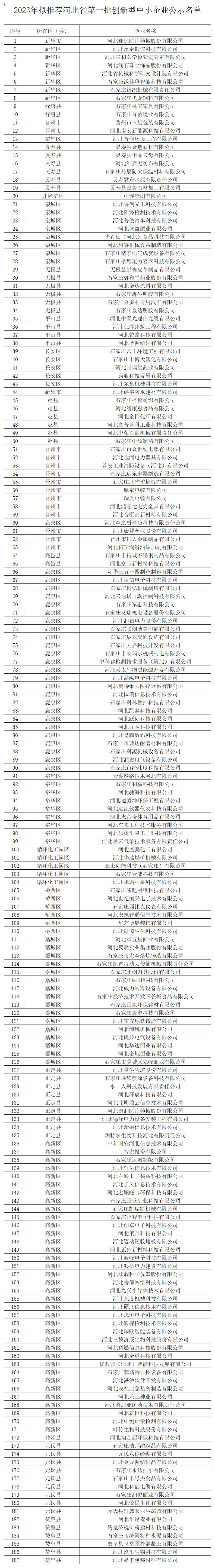 關(guān)于擬推薦2023年河北省第一批創(chuàng)新型中小企業(yè)名單的公示根據(jù)河北省工信廳《關(guān)于做好2023年優(yōu)質(zhì)中小企業(yè)信息更新和河北省創(chuàng)新型中小企業(yè)評(píng)價(jià)