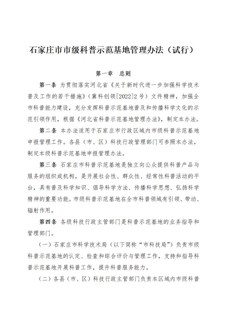 關(guān)于《石家莊市市級(jí)科普示范基地管理辦法(試行)》公開(kāi)征求意見(jiàn)的通知石家莊市科學(xué)技術(shù)局各有關(guān)單位:根據(jù)《河北省科普示范基地管理辦法》