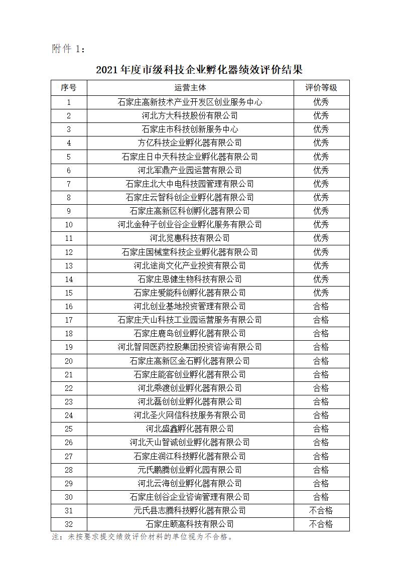 2021年度石家莊市科技企業(yè)孵化載體績效評價結(jié)果公示根據(jù)《關(guān)于開展石家莊市科技企業(yè)孵化載體2021年度績效評價工作的通知》(石科高函〔2022