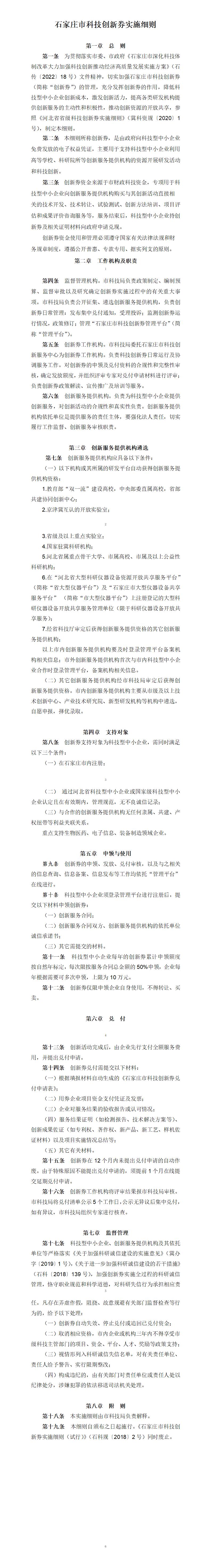 關(guān)于《石家莊市科技創(chuàng)新券實施細(xì)則》公開征求意見的函石家莊市科學(xué)技術(shù)局各有關(guān)單位:根據(jù)《河北省省級科技創(chuàng)新券實施細(xì)則》,市科技局起草