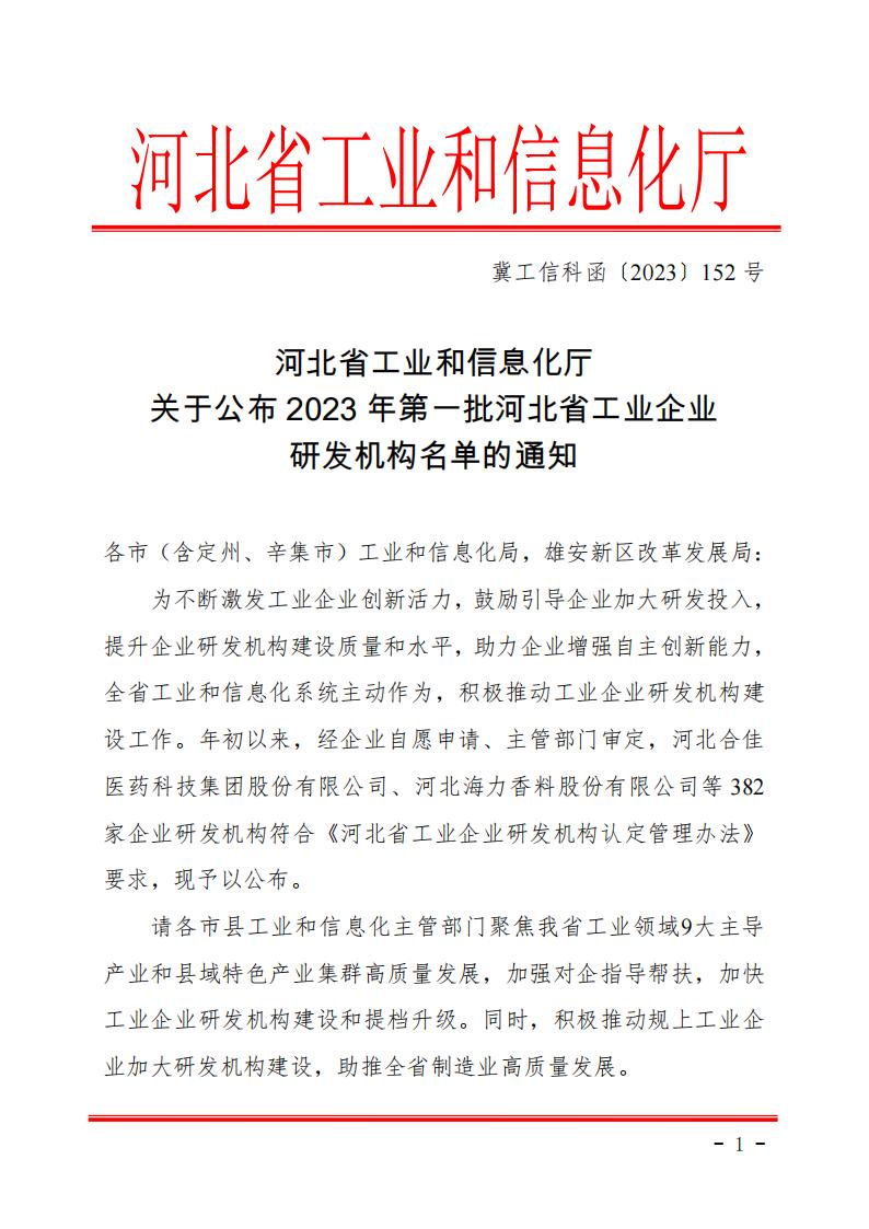 河北省工業(yè)和信息化廳關于公布2023年第一批河北省工業(yè)企業(yè)研發(fā)機構名單的通知各市(含定州、辛集市)工業(yè)和信息化局,雄安新區(qū)改革發(fā)展局: