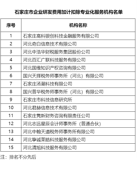 石家莊市科學技術局關于企業(yè)研發(fā)費用加計扣除專業(yè)化服務機構名單的公示各有關單位:按照《石家莊市科學技術局關于組織開展石家莊市企業(yè)研發(fā)
