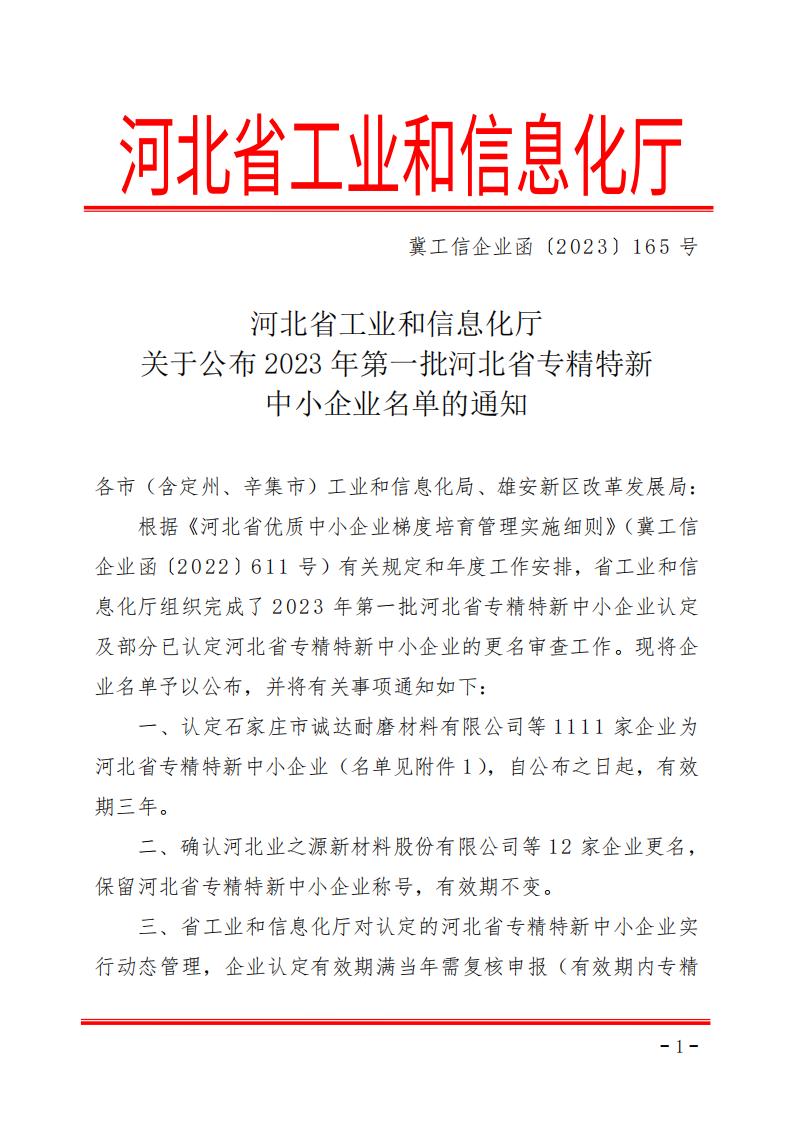 河北省工業(yè)和信息化廳關于公布2023年第一批河北省專精特新
