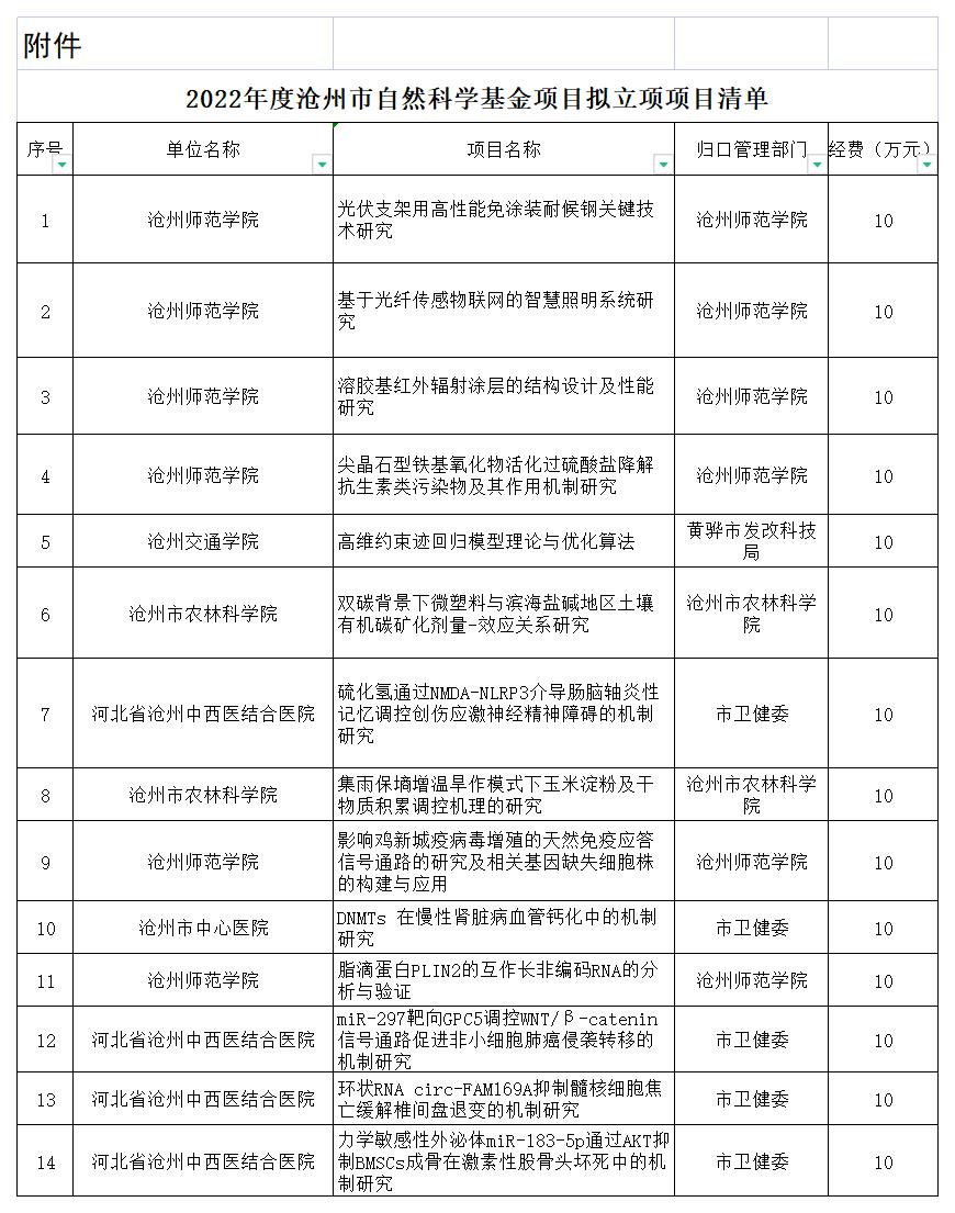 滄州市科技局關(guān)于2022年度滄州市自然科學(xué)基金項(xiàng)目擬立項(xiàng)項(xiàng)