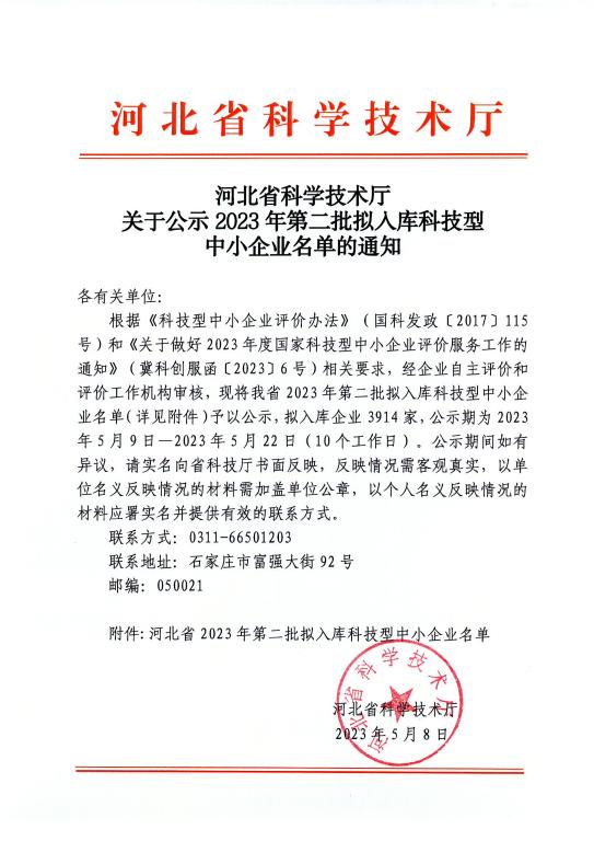 河北省2023年第2批入庫科技型中小企業(yè)名單 根據(jù)《科技型中小企業(yè)評價辦法》(國科發(fā)政〔2017〕115號)和《科技型中小企業(yè)評價服務(wù)工作指引