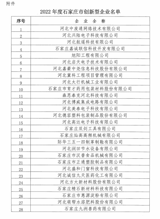 關(guān)于公布石家莊市創(chuàng)新型企業(yè)的通知 各縣(市)、區(qū)科技局,市政府國資委監(jiān)管企業(yè),各縣(市)區(qū)總工會、各產(chǎn)業(yè)工會,市直屬基層工會:根