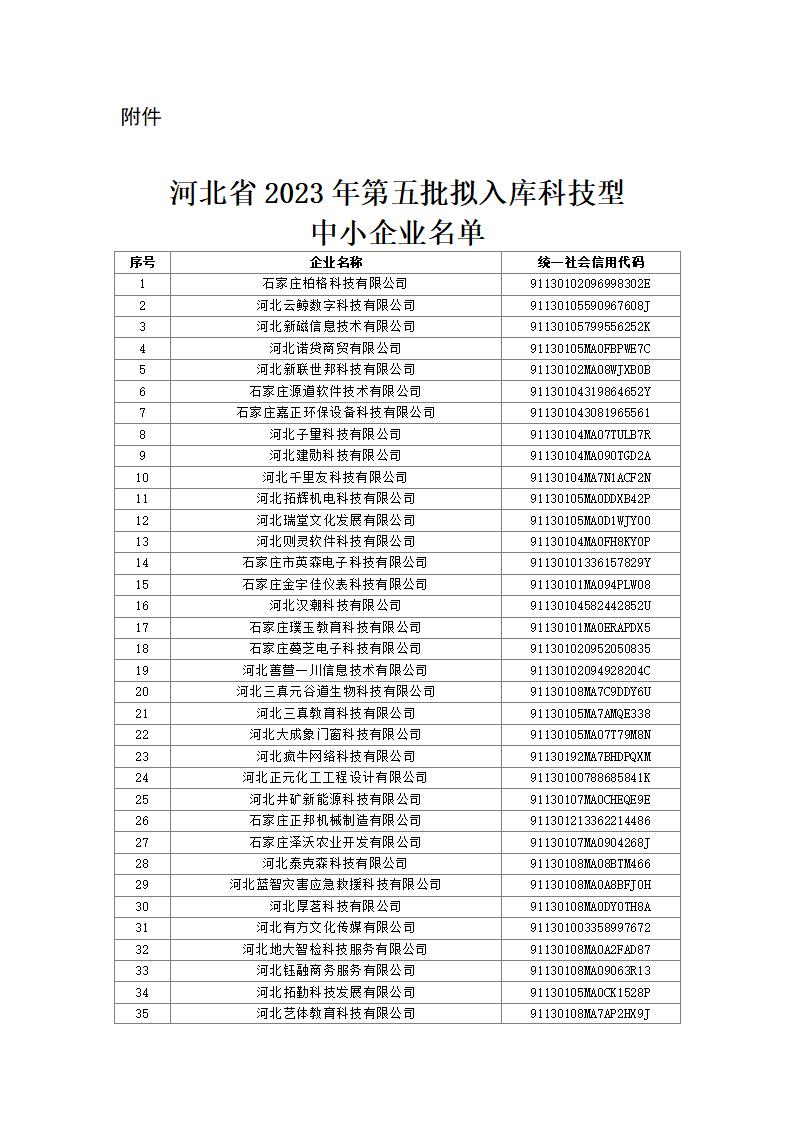 河北省科學(xué)技術(shù)廳關(guān)于公示2023年第五批擬入庫(kù)科技型中小企業(yè)名單的通知各有關(guān)單位: 根據(jù)《科技型中小企業(yè)評(píng)價(jià)辦法》(國(guó)科發(fā)政〔2017〕