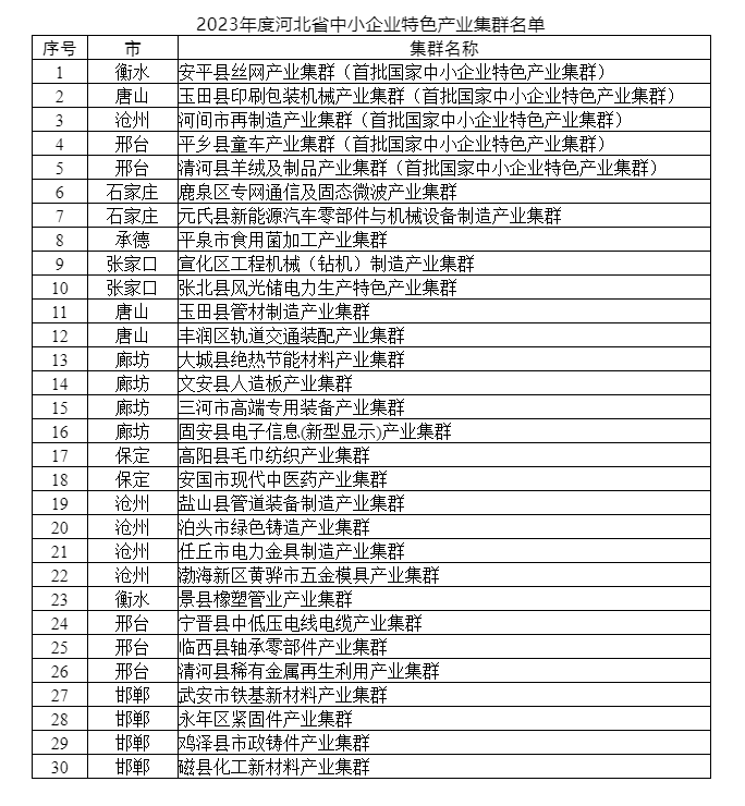 關(guān)于公布2023年度河北省中小企業(yè)特色產(chǎn)業(yè)集群名單和培育名單的通知冀工信民經(jīng)函〔2023〕366號(hào)各市(含定州、辛集市)工業(yè)和信息化局、雄安