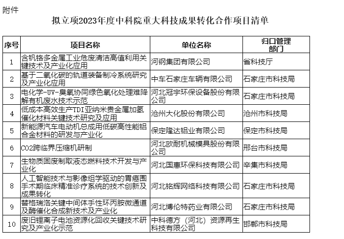 關(guān)于擬立項(xiàng)2023年度中科院重大科技成果轉(zhuǎn)化合作項(xiàng)目的公示河北省科學(xué)技術(shù)廳各有關(guān)單位: 根據(jù)《2023年度中科院重大科技成果轉(zhuǎn)化合作項(xiàng)目