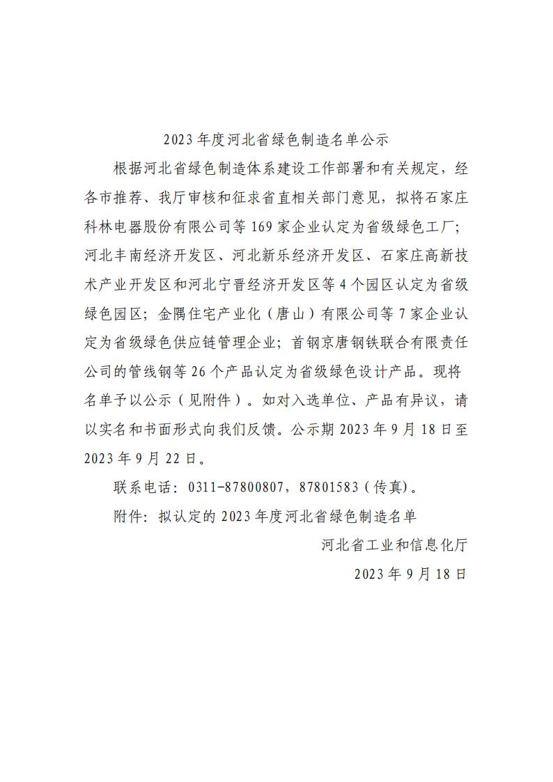 2023年度河北省綠色制造名單公示