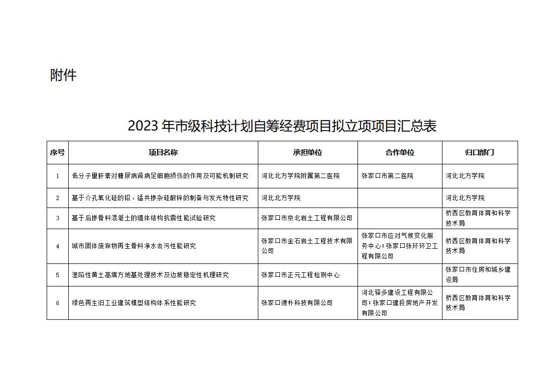 張家口市科學(xué)技術(shù)局關(guān)于2023年市級科技計(jì)劃自籌經(jīng)費(fèi)項(xiàng)目擬立項(xiàng)項(xiàng)目的公示根據(jù)《張家口市市級科技計(jì)劃項(xiàng)目管理辦法》(張科字〔2019〕97號)