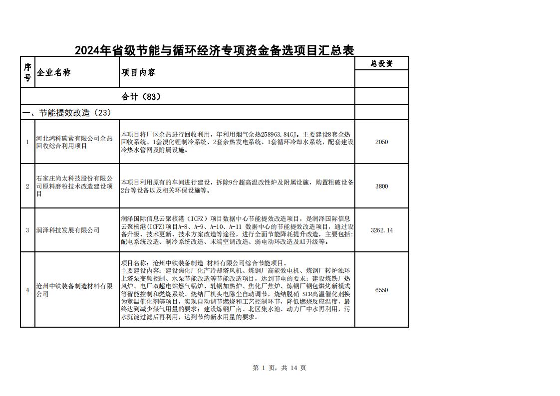 申請2024年省級(jí)節(jié)能與循環(huán)經(jīng)濟(jì)專項(xiàng)資金備選項(xiàng)目的公示根據(jù)河北省發(fā)展和改革委員會(huì)《關(guān)于組織申報(bào)2024年省級(jí)節(jié)能與循環(huán)經(jīng)濟(jì)專項(xiàng)資金備選項(xiàng)目