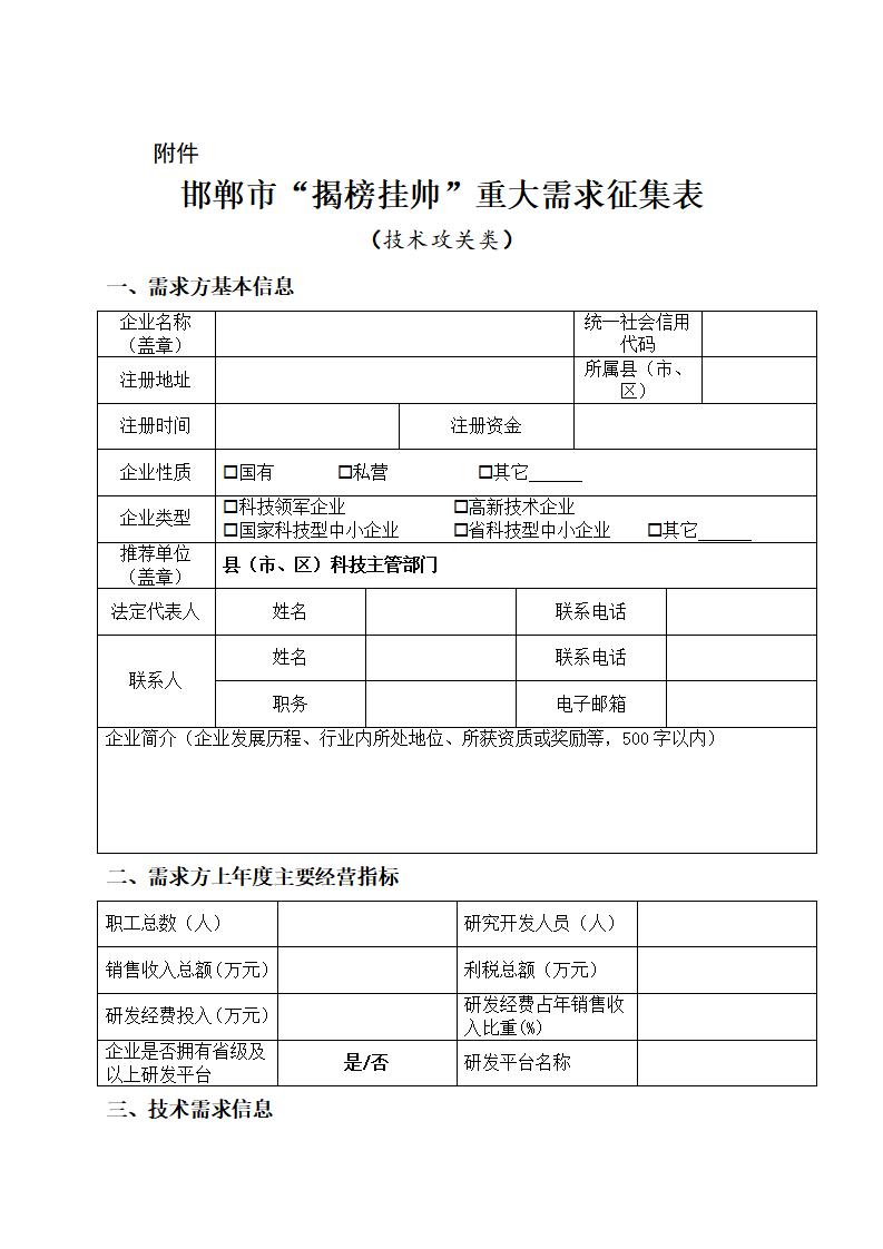 關(guān)于征集科技計(jì)劃項(xiàng)目“揭榜掛帥” 重大需求的通知發(fā)布日期:2023 11 16各縣(市、區(qū))科技管理部門、冀南新區(qū)經(jīng)發(fā)局、經(jīng)開區(qū)創(chuàng)業(yè)中心,有