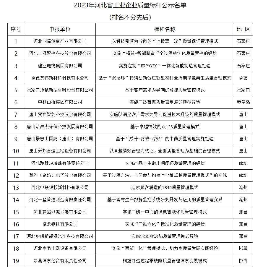 關(guān)于2023年河北省工業(yè)企業(yè)質(zhì)量標(biāo)桿名單的公示