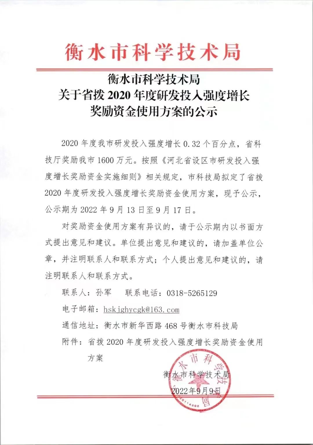 衡水市科學(xué)技術(shù)局關(guān)于省撥2020年度研發(fā)投入強度增長獎勵資金使用方案的公示