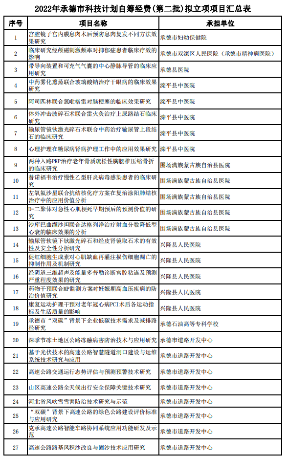 承德市科學(xué)技術(shù)局關(guān)于2022年承德市科技計劃自籌經(jīng)費(第二批)擬立項項目的公示根據(jù)《承德市市級科技項目管理辦法》有關(guān)規(guī)定,現(xiàn)對2022年承