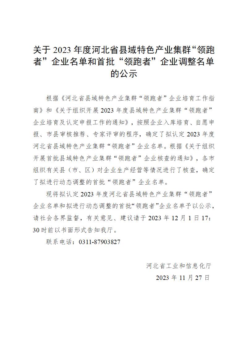 關(guān)于2023年度河北省縣域特色產(chǎn)業(yè)集群“領(lǐng)跑者”企業(yè)名單和首批“領(lǐng)跑者”企業(yè)調(diào)整名單的公示 根據(jù)《河北省縣域特色產(chǎn)業(yè)集群“領(lǐng)跑者”企業(yè)