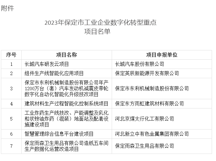 保定市工業(yè)和信息化局關(guān)于2023年保定市工業(yè)企業(yè)數(shù)字化轉(zhuǎn)型重點(diǎn)項(xiàng)目的公示按照保定市工信局、保定市財(cái)政局《關(guān)于組織開展2023年保定市工業(yè)企