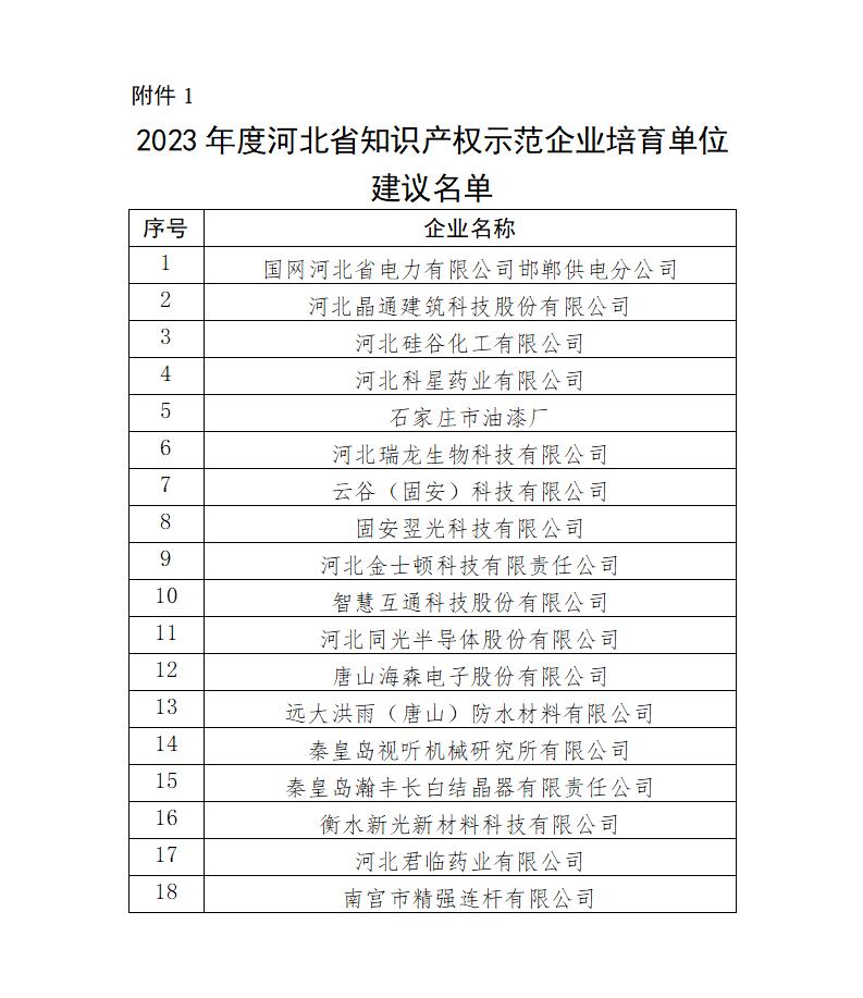 河北省市場監(jiān)督管理局關(guān)于2023年度河北省知識(shí)產(chǎn)權(quán)優(yōu)勢示范企業(yè)培育單位確定和復(fù)核結(jié)果的公示 按照河北省市場監(jiān)督管理局《關(guān)于開展2023年