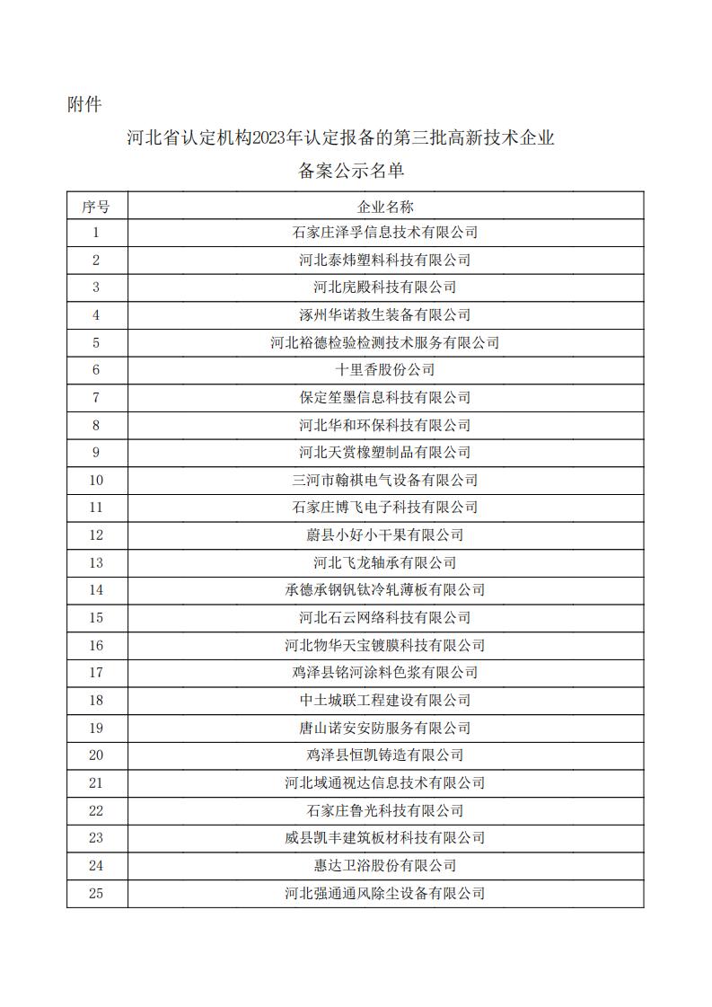 對(duì)河北省認(rèn)定機(jī)構(gòu)2023年認(rèn)定報(bào)備的第三批高新技術(shù)企業(yè)擬進(jìn)行備案的公示根據(jù)《高新技術(shù)企業(yè)認(rèn)定管理辦法》(國科發(fā)火〔2016〕32號(hào))和《高新