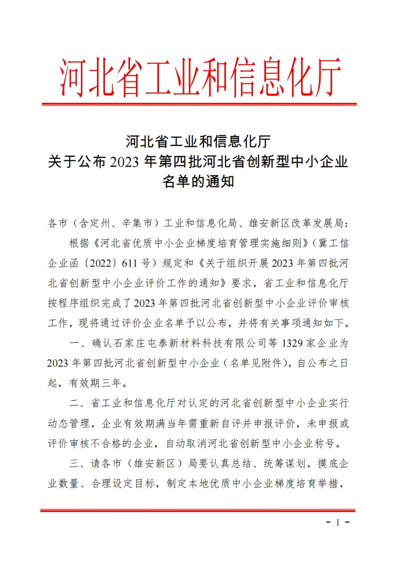 關(guān)于公布2023年第四批河北省創(chuàng)新型中小企業(yè)名單的通知各市(含定州、辛集市)工業(yè)和信息化局、雄安新區(qū)改革發(fā)展局: 根據(jù)《河北省優(yōu)質(zhì)中