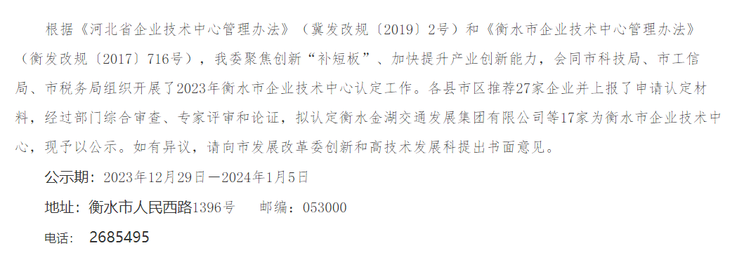 關(guān)于2023年擬認(rèn)定衡水市企業(yè)技術(shù)中心的公示